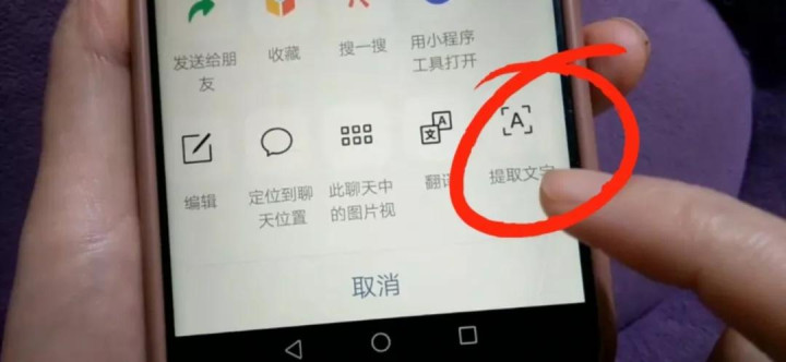 然后怎么做呢?原来也是很简单的。我们只需要把这张图片点开,然后用单指把它长按着,立刻在下方这里我们往左滑动,就出现了一个“提取文字”。