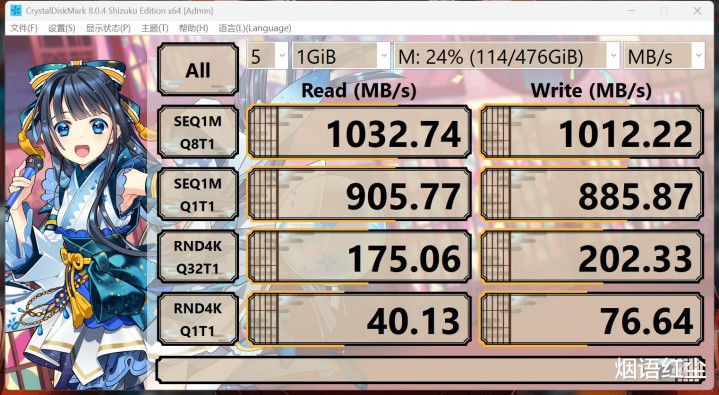 实际测试中,阿卡西斯磁吸硬盘盒搭配固态硬盘,在Windows平台通过Type-C接口连接,读取速度达到1032.74MB/s,写入速度1012.22MB/s,基本达到了接口的理论上限。